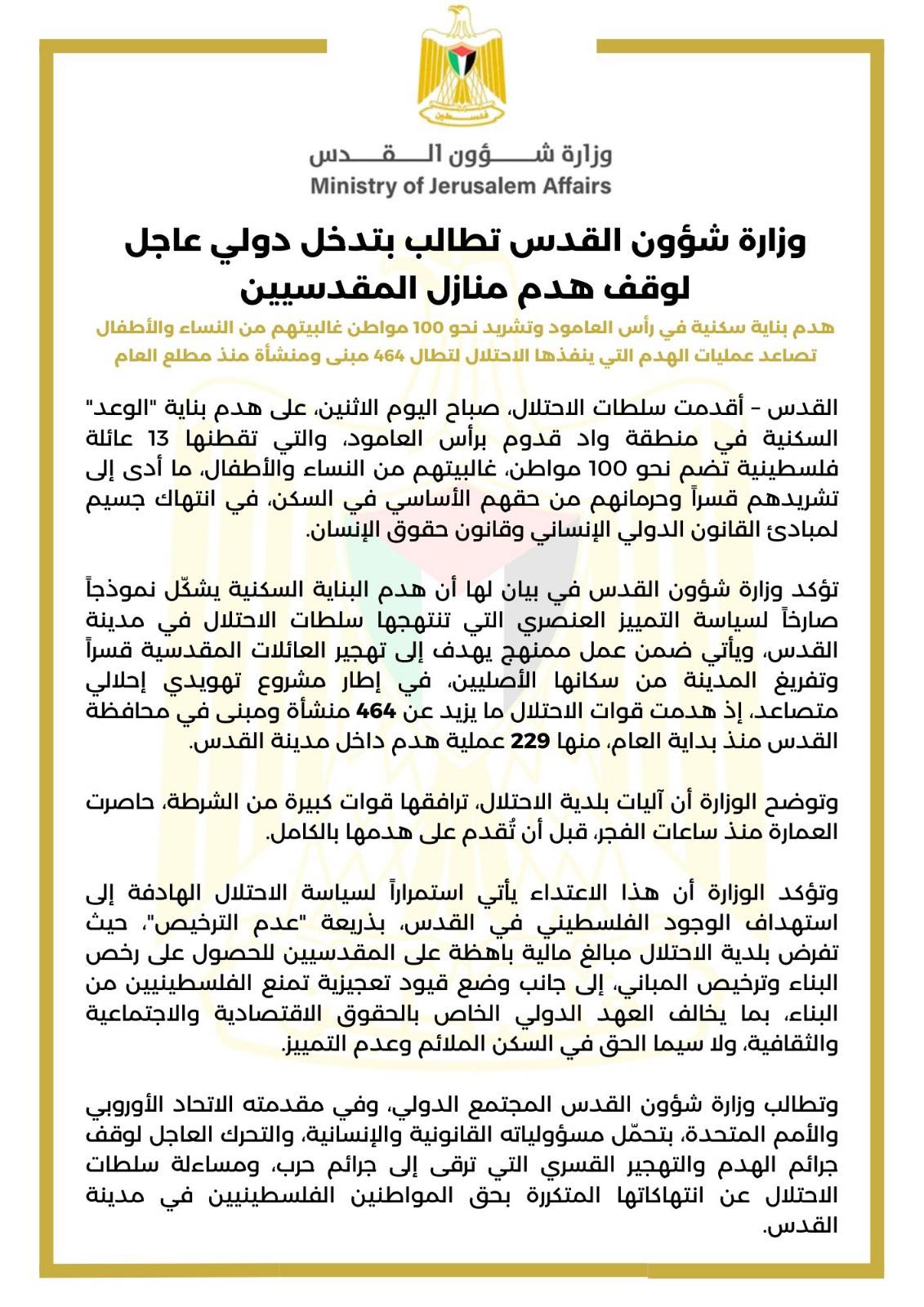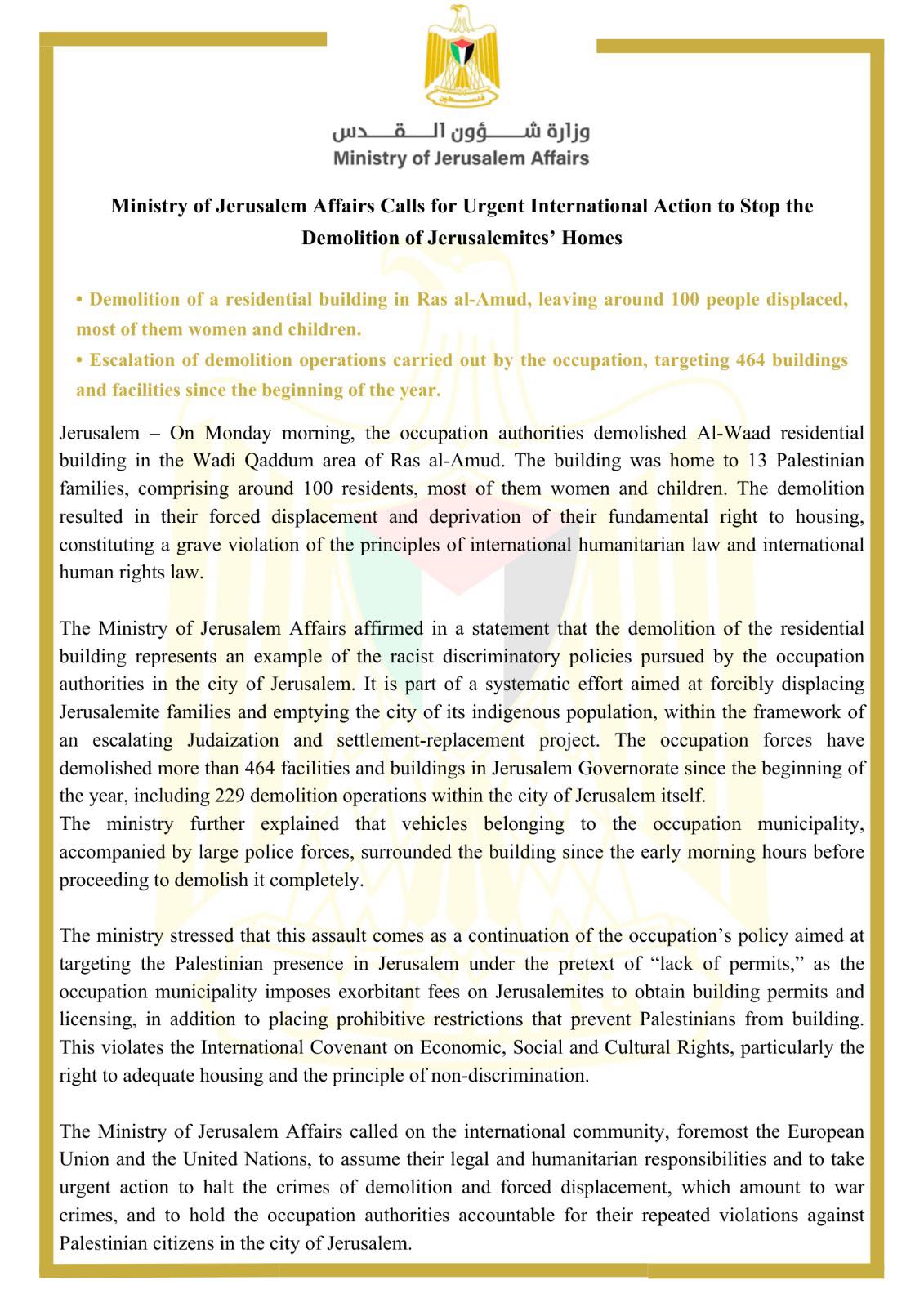 وتطالب وزارة شؤون القدس المجتمع الدولي، وفي مقدمته الاتحاد الأوروبي والأمم المتحدة، بتحمّل مسؤولياته القانونية والإنسانية، والتحرك العاجل لوقف جرائم الهدم والتهجير القسري التي ترقى إلى جرائم حرب، ومساءلة سلطات الاحتلال عن انتهاكاتها المتكررة بحق المواطنين الفلسطينيين في مدينة القدس.